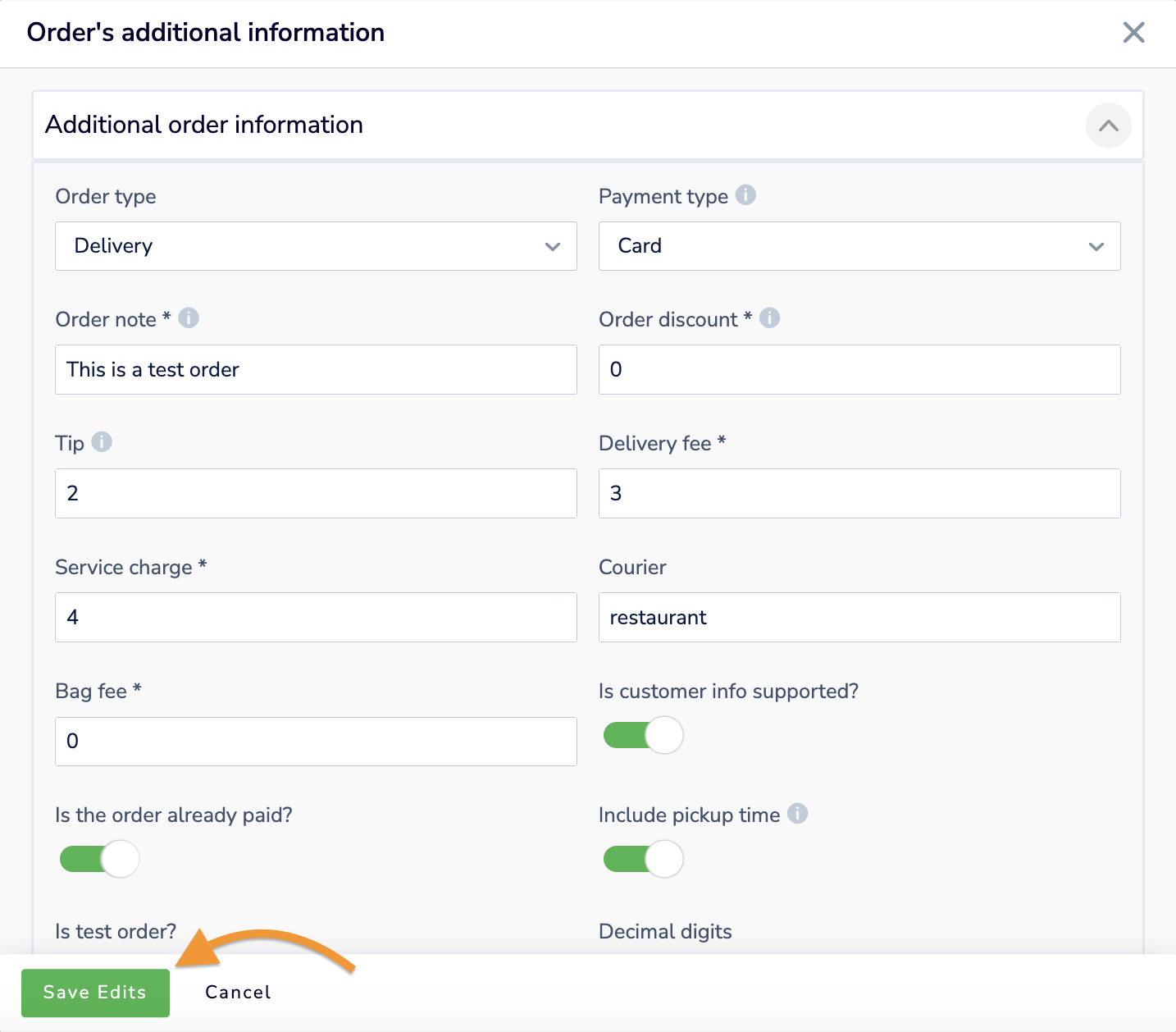 Go to the Locations page and select the Edit button for the location. Ensure the following toggles in the Order Payment section are active.- Send Discounts