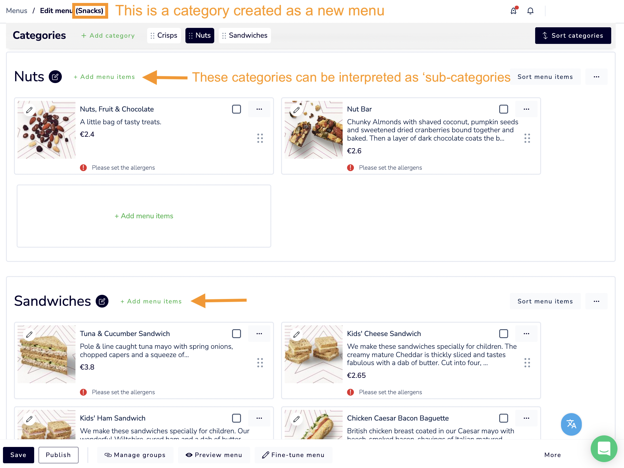 Some customers prefer categories to be further divided into subcategories, which helps to manage larger product offerings (e.g., grocery stores). Deliverect has support for this.