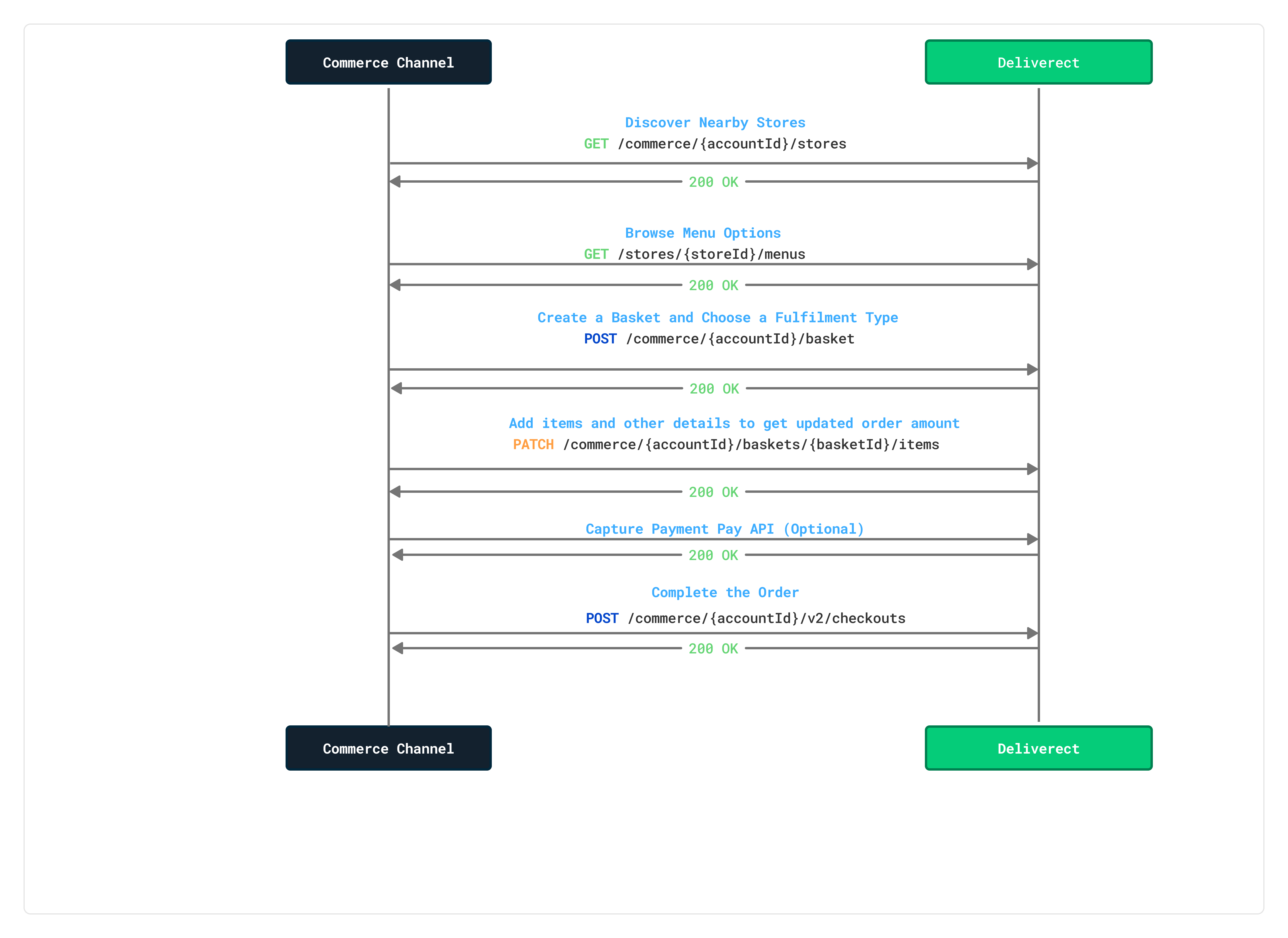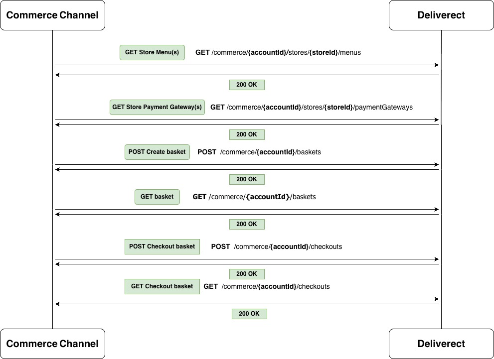 Below is a high-level overview of the key Commerce API interactions, with a brief description of the role they play in supporting the complete ordering journey from store discovery through to POS order injection;
