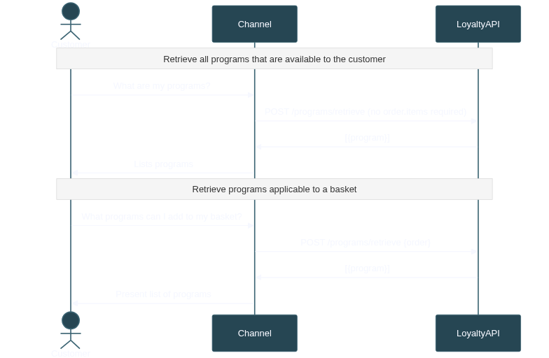 This endpoint allows channels to retrieve a list of loyalty programs available to a customer. It supports two different use cases, each requiring a different level of detail in the request payload.